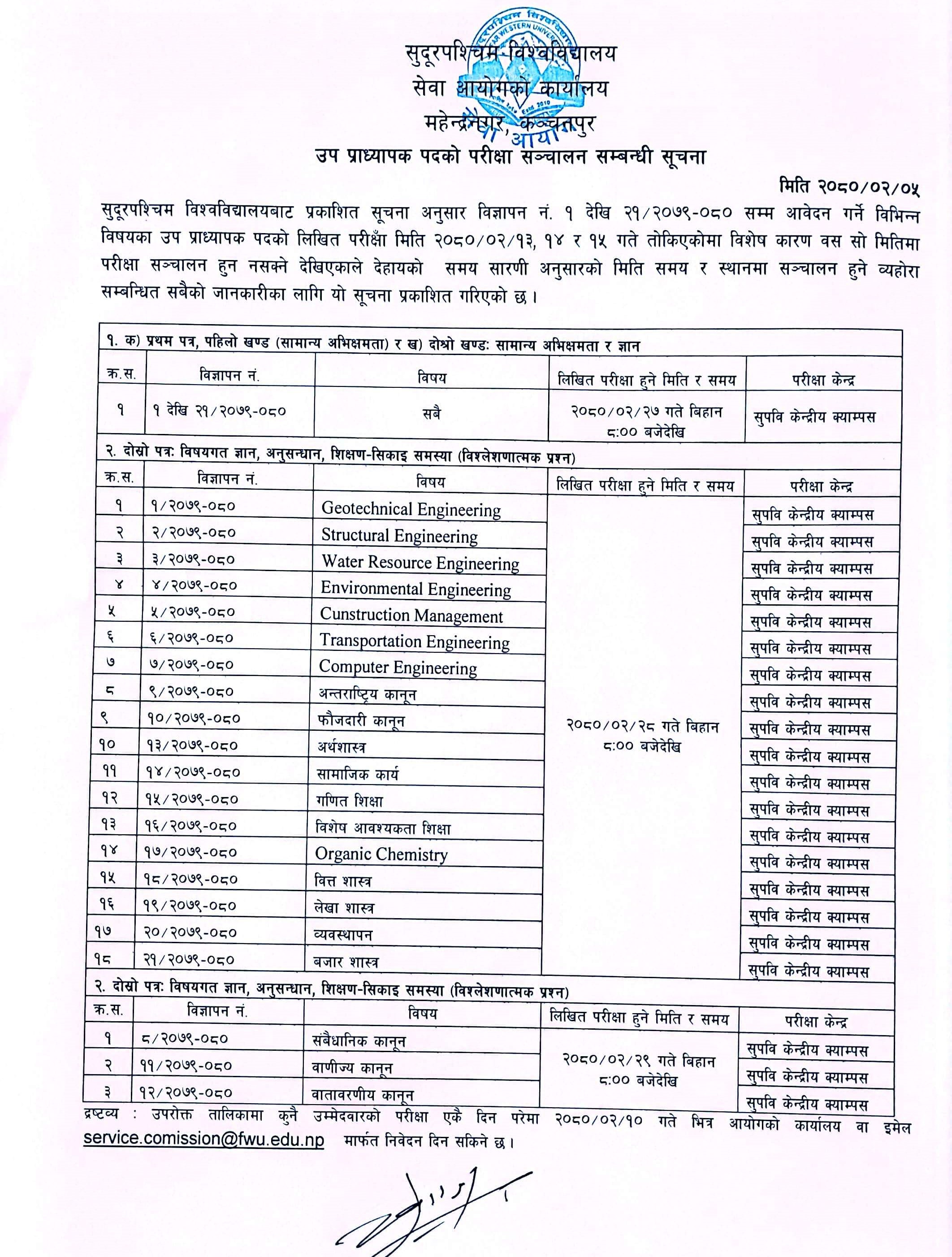 शिक्षण तर्फ उपप्राध्यापक पदको लिखित परीक्षासम्बन्धी सूचना